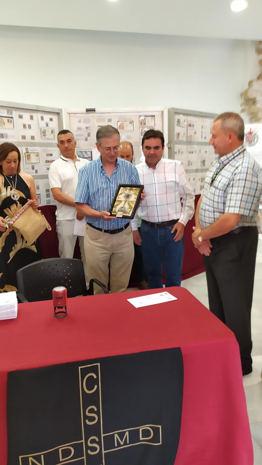 | EL C.F.N.L., POR MEDIO DE SU PRESIDENTE, ENTREGÓ UN OBSEQUIO CON EL ESCUDO DE LA ASOCIACIÓN FILATÉLICA Y NUMISMÁTICA LINARENSE, AL EXCMO. AYUNTAMIENTO DE PORCUNA EN LA FIGURA DE SU ALCALDE |